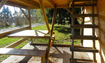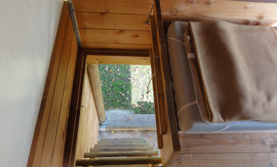 - A bedroom area up high, accessible by a ladder, offering comfortable sleeping for 2 people, with mattresses, pillows and duvets provided.