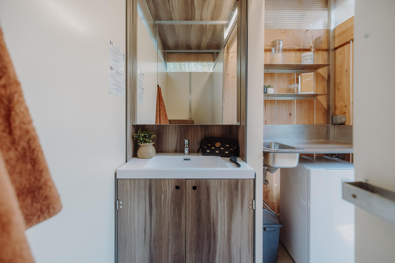Chaque emplacement dispose de son sanitaire privé, comprenant une salle d’eau avec douche, WC et lavabo, ainsi qu’un espace kitchenette équipé d’un évier (attention : le réfrigérateur n’est pas inclus, mais disponible à la location pour ce type de sanitaire privé).