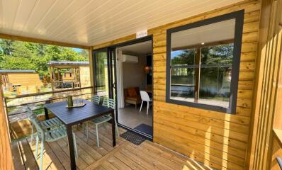 La terrasse couverte de 9m², équipée d’une plancha/barbecue, est parfaite pour savourer vos repas en plein air tout en admirant la tranquillité de l’étang. Cet espace extérieur ajoute une touche supplémentaire de sérénité à votre séjour, en harmonie avec le cadre naturel environnant.