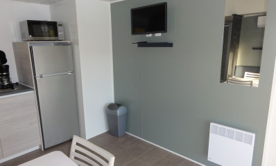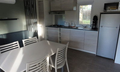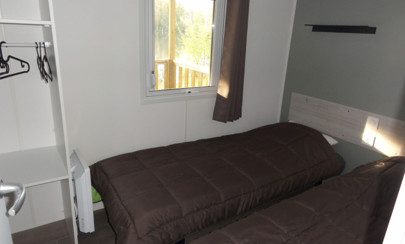 Mobile home premium with 2 bathrooms.Air conditioning, half covered terrace / Direct view and access to the campsite lake.