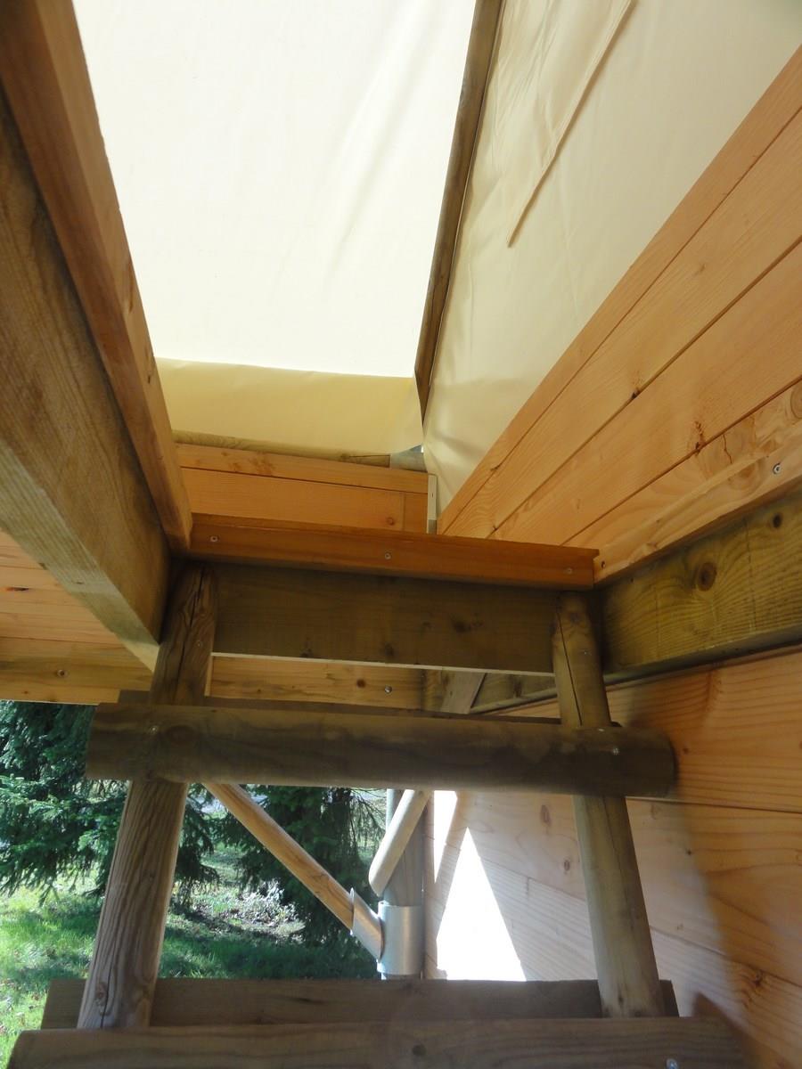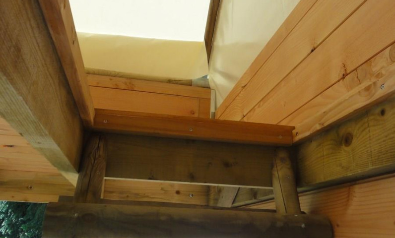 Een slaapkamer hoog, bereikbaar via een ladder, voor 2 personen comfortabel slapen, met matrassen, kussens en dekbedden.