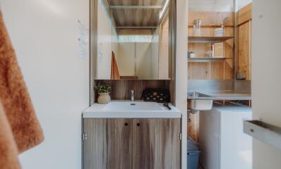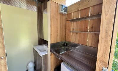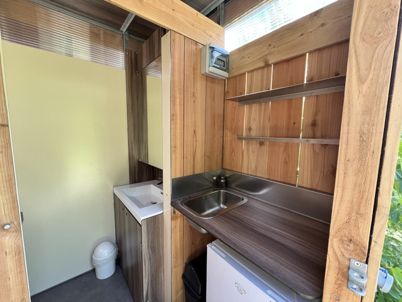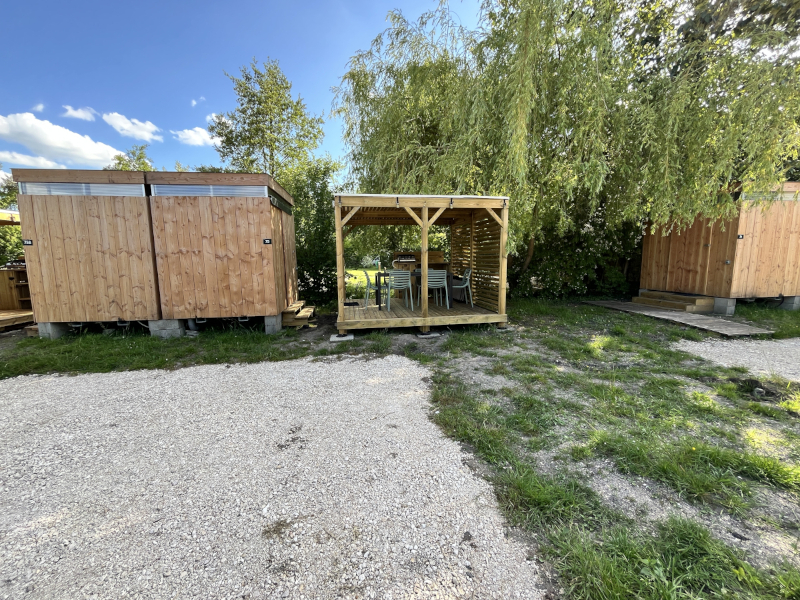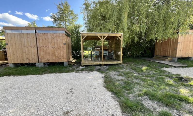 Elke staanplaats heeft een volledig uitgeruste privébadkamer, inclusief douche, wastafel en toilet, die direct op uw perceel is geïnstalleerd. Vergeet de wachtrijen voor de gemeenschappelijke badkamers en geniet van modern comfort in alle privacy. Dit innovatieve concept voldoet perfect aan de verwachtingen van kampeerders die op zoek zijn naar praktisch gemak en autonomie, met behoud van de gezellige sfeer van kamperen.
