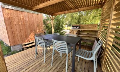 Ingerichte buitenruimte: een overdekt houten terras met tuinmeubilair, inclusief een tafel en 4 stoelen, nodigt u uit om buiten te eten of te ontspannen met uw gezin.